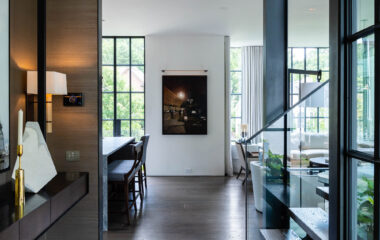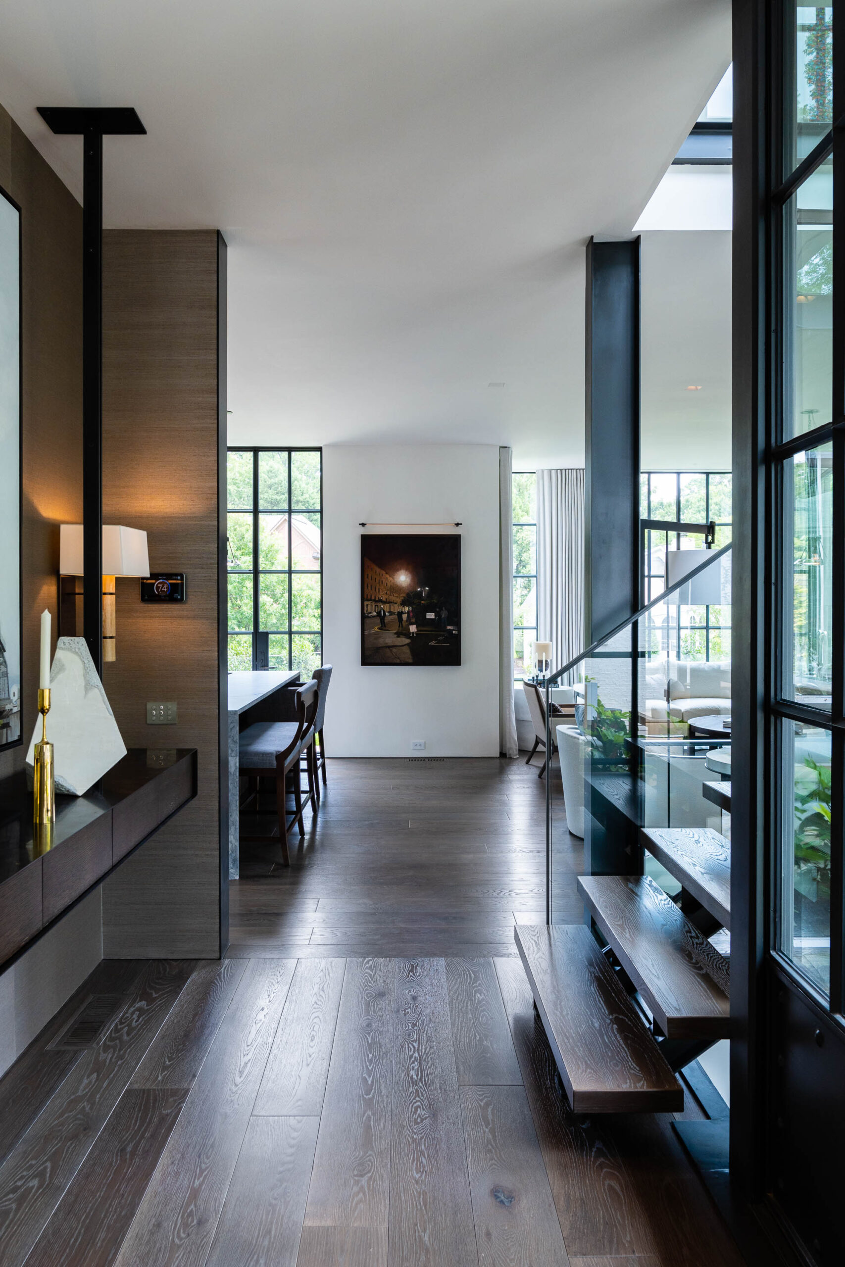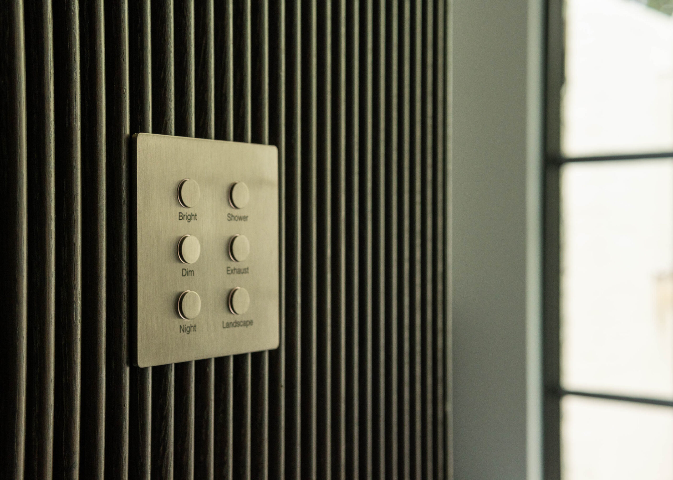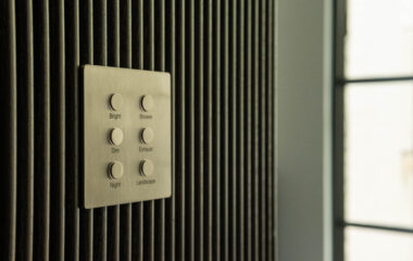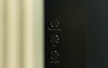 The most visible technology in the home is Lutron Alisse keypads in brushed metal. Selected to work in harmony with door hardware, the keypads are a beautiful but unobtrusive addition to the coherent design aesthetic. The Alisse keypads control a Lutron Homeworks QSX system and Lutron Palladiom shades. Selected lights on the Lutron system have also been equipped with a Tesla Powerwall and solar system, which keeps them available even when power goes out.